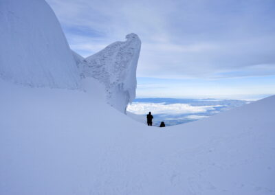 Chimborazo has 4 main summits, from West to East there are: Ventimilla 6297m/ 20561ft, Whymper 6310m/ 20702ft, Politecnica 5820m/ 19094ft and Nicolas Martinez 5570m/ 18274ft. The summits Ventimilla and Whymper are huge snow domes linked by a shadow depression that drops less than 50m below the main summit.