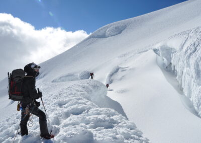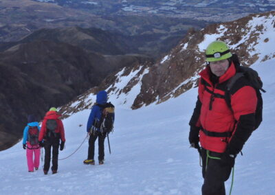 The normal route became a challenge and requires some expertise and skills on ice techniques. Its steepness is more continuous but offers a direct uphill line to the top after El Castillo area, now days this route is installed a Via Ferrata. In addition, rock falls are often reported depending on prevalent conditions, giving Chimborazo the reputation of currently being an adventurous climb. Actually, choosing the best route will depend on your guide’s criteria and experience, Sierra Nevada Expeditions guarantee you Certified ASEGUIM UIAGM guides.